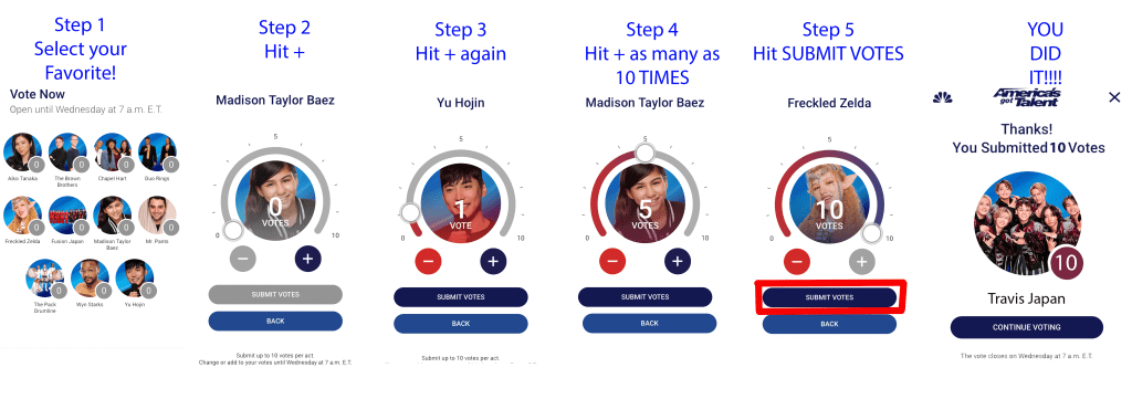For US fans of Travis Japan who are unable to attend the taping (and vote in person), there are a few ways to do it. NBC Insider (the show’s network blog) has made it super easy, though it is different than previous seasons. All you have to do is head to the AGT app or go to NBC.com/AGTVote.