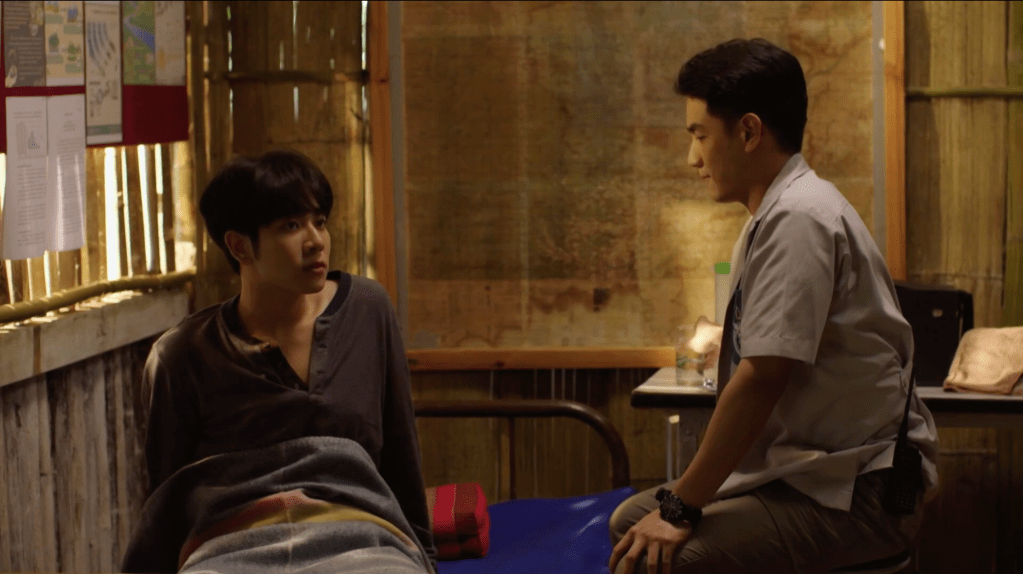 Phua and the rangers discover that the fire at the school was not an accident but arson. Also, everyone knows that it’s because Tian dared challenge Sakda’s men. Fearing they might return to finish him off, Phua demands that Tian stay with him, in his cabin for protection. After A shower, Phua helps Tian clean himself. He even offers for Tian to have the bed. After a bit of an argument, Phua decides that the best way Tian can repay him is by giving him a massage – which is something he’s in desperate need of. Once finished it’s not only decided that the two will share the bed, but that Phua will hold on to him (read: Cuddle) to ensure his safety.