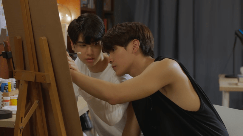 After spending an entire afternoon at the mall with no luck finding a gift, Nuea offers to draw a portrait for her. Kluen accepts the offer and after treating him to dinner spends the rest of the evening watching him work. It’s a total “heartbeat” moment that almost turns into a kiss, but it is ruined when Gia calls Kluen’s phone. He sends her straight to voicemail which causes Nuea to crack a joke about what a shitty boyfriend he is. “Have you ever had me as a boyfriend?” Kluen asks. “If not, how can you say I’m shitty?”