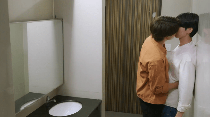 In the bathroom, Kluen pushes Nuea to the wall and kisses him. Confused, and thinking he’s drunk, Nuea pushes him away. Coming back to him, Kluen kisses him again, then embraces him. The two argue about Nuea’s feelings before Nuea finally leaves the restroom.