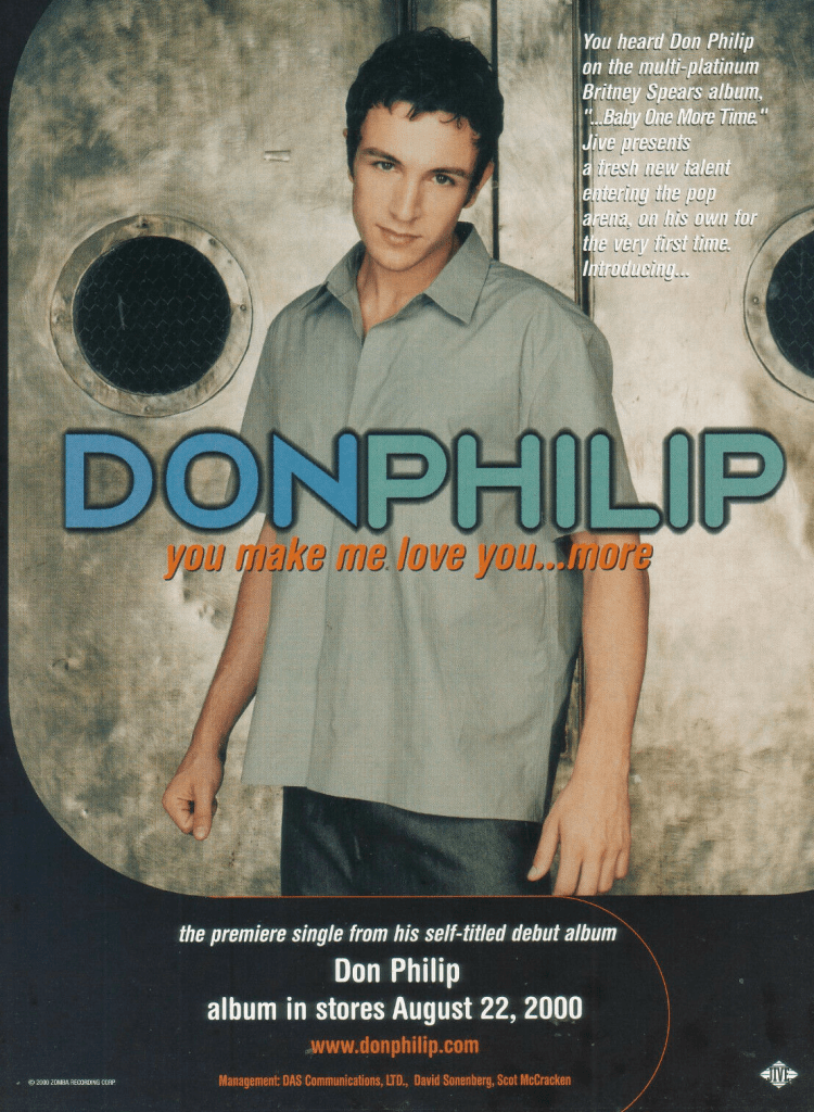 In the late 90s, JIVE records boasted some of the biggest names in pop music, Nysnc, Aaron Carter, Backstreet Boys, Britney Spears, and Steps. They had all of the artists I was listening to, including Don Philip – a Miami native with an incredible voice and looks to match. With deep dark eyes, tousled hair, and a mischievous smile against the face of an angel and the body of a Greek God, Philip was the perfect package.