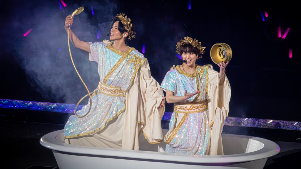 This one was pure comedic gold! While Sakuma’s knack for humor is well-known, seeing Meguro dive headfirst into it was an unexpected and thoroughly delightful surprise. His adorable expressions and willingness to play along just made him even more endearing than he already is. Their chemistry was magnetic, and the costumes—bold, sparkly, and Olympian in style—cranked the performance’s over-the-top charm to the max. Honestly, Meguro being this cute while being this funny? Total fan service—and I wholeheartedly approve!