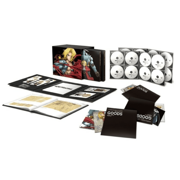 There are a total of 28 disc in this set, that contain all 51 episodes of the original TV series (on DVD), the movie (on Blu-ray), and an avalanche of premium extras including special bonus footage and all original soundtracks (to that point)—featuring theatrical themes like L’ArcenCiel’s 「Link」 and 「LOST HEAVEN」—plus an archive book packed with rare and unpublished materials, including illustrations from Yoshiyuki Ito and original creator Hiromu Arakawa.